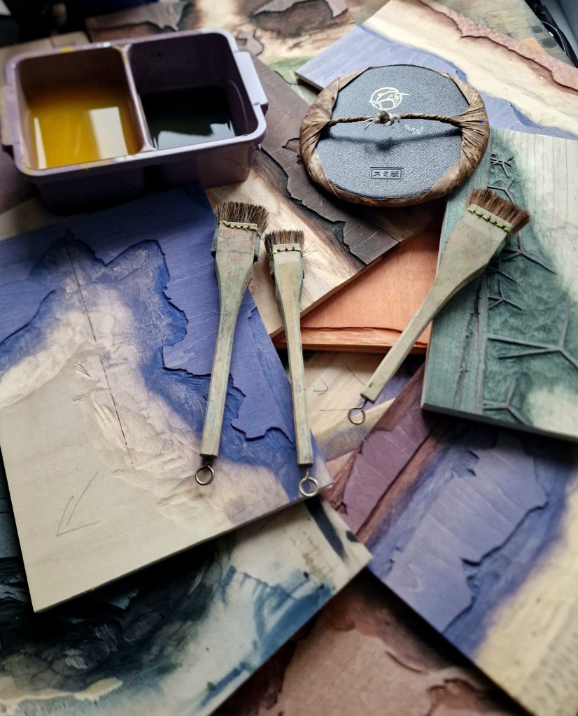 Japanese woodblock or Mokuhanga is a traditional Japanese relief printing process. It uses no solvents, just water-colour/pigment, starch paste and water, applied with brushes. It doesn’t require a press, just a hand-held disc called a baren.